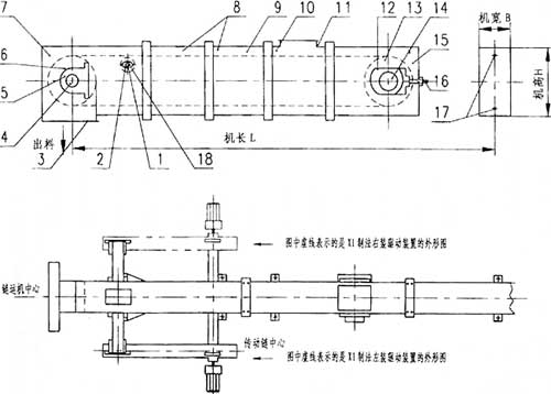9、輸送鏈 10、中間節(jié)(非標) 11、進料口 12、尾軸承箱 13、尾輪 14、尾軸 15、尾部