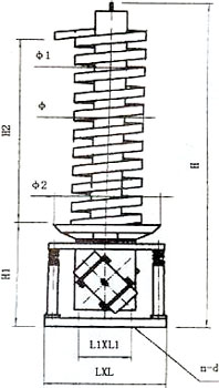ZC系列垂直振動輸送機(jī)的驅(qū)動裝置振動電機(jī)安裝在輸送塔下部,兩臺振動電機(jī)對稱交叉安裝,輸送塔由管體和焊接在管體周圍的螺旋輸送槽組成,輸送塔座于減振裝置上,減振裝置由底座和隔振彈簧組成。(見圖一)當(dāng)垂直輸送機(jī)工作時(shí),根據(jù)雙振動電機(jī)自同步原理,由振動電機(jī)產(chǎn)生激振力,強(qiáng)迫整個輸送塔體作水平圓運(yùn)動和向上垂直運(yùn)動的空間復(fù)合振動,螺旋槽內(nèi)的物料則受輸送槽的作用,作勻速拋擲圓運(yùn)動,沿輸送槽體向上運(yùn)動,從而完成物料的向上(或向下)輸送作業(yè)。